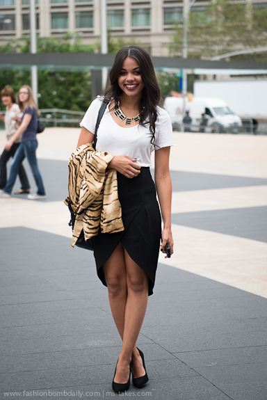 This young lady embraced chic simplicity in a white top and black skirt, uplifted by a Tiger Print Zara blazer.