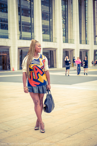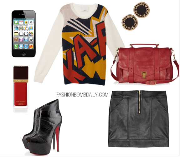 This morning I hightailed it over to Lincoln Center to attend the BCBG and Richard Chai shows. Fashion Week is such an exciting time, and Day 1 literally felt like the first day of school for me! I decided to bless the occasion with a schoolgirl inspired outfit, including a 3.1 Phillip Lim KA-POW Comic-Print Sweater and a Milly Delphine flared leather skirt: