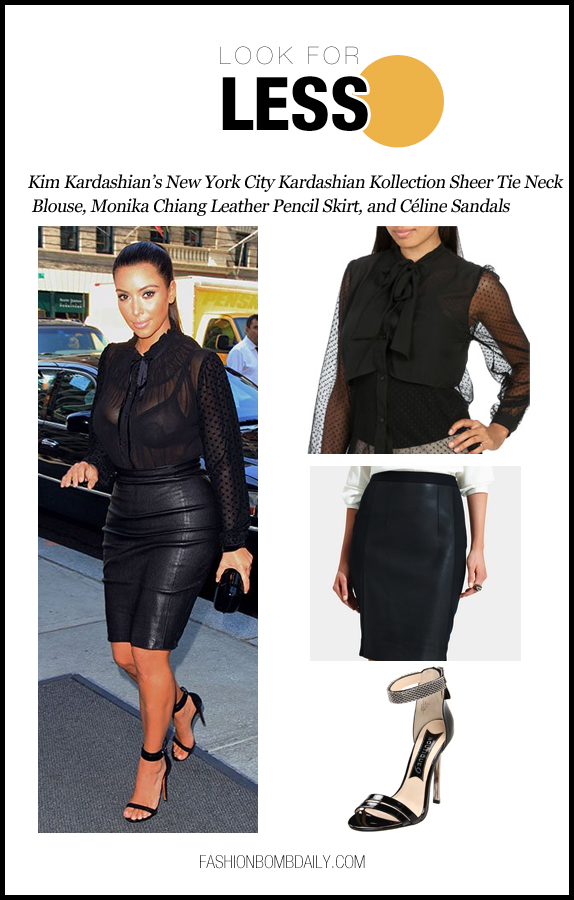 Kim Kardashian was spotted out and about in NYC, before heading to Sears in Yonkers, NY to commemorate the first anniversary of the Kardashian Kollection line. For the occasion, she stepped out in a sheer tie-neck blouse from the collection, a $525 Monika Chiang Leather Pencil Skirt, and her favorite Céline sandals: