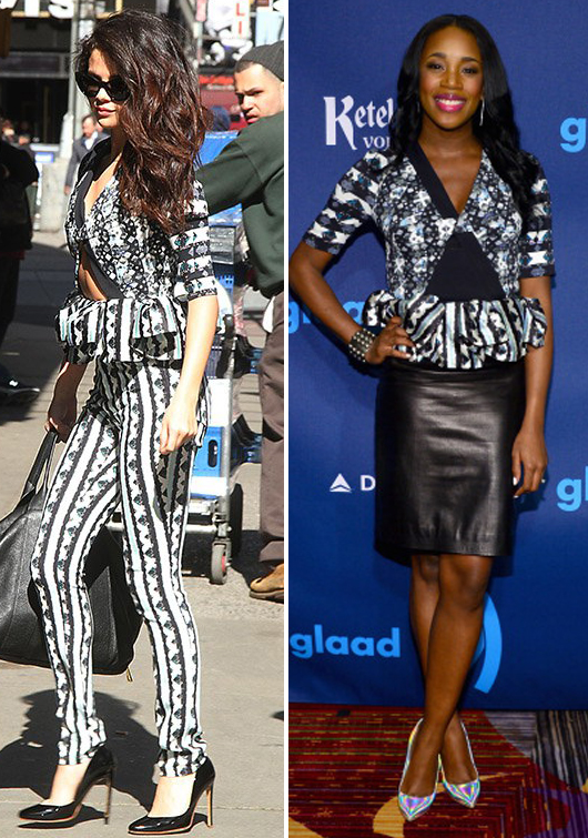 Selena Gomez was snapped in New York City wearing the same $1,540 Peter Pilotto Lara Crepe and Silk Peplum Top DJ Kiss wore in March.