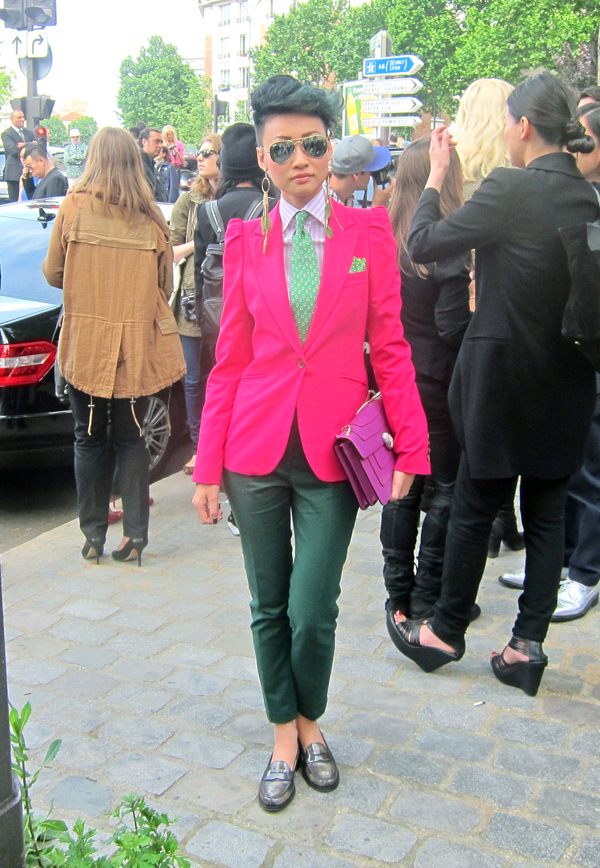 I snapped this picture of Esther Quek outside the Dior Homme show. Please note two things: How much better Julien’s camera is than mine. How fly she is. I’m loving the colors and haberdashery!