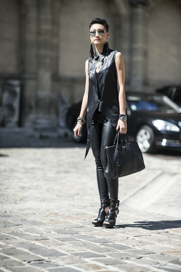 I officially have a new street style crush, and her name is Esther Quek. The Group Fashion Director of The Rake always looks beautifully bada$$, accessorizing masculine separates with supremely feminine touches, like dangling earrings.