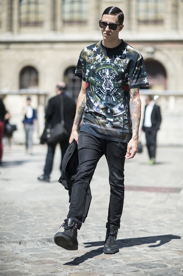 Givenchy isn’t only beloved by rappers and ballers! This slick haired model looked quite handsome in black slacks, sturdy boots, and the label’s Columbian fit plane printed tee.
