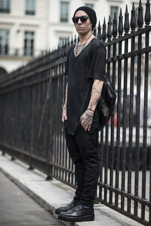 And this young man allowed his tattoos to take center stage in a black v-neck tee and black loose fit pants.