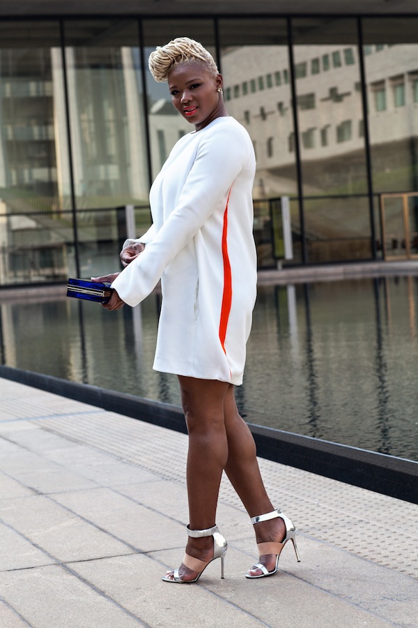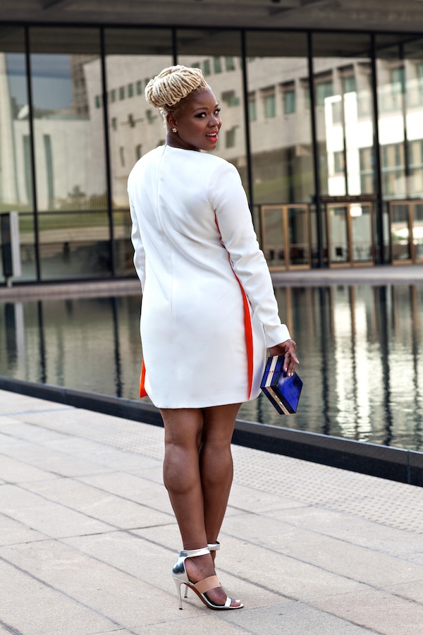 The dress actually has a pop of orange color on the back, so I coordinated my lipstick with a mixture of MAC’s Lady Danger and Morange (you can achieve a similar look by using the brand’s So Chaud hue as well).