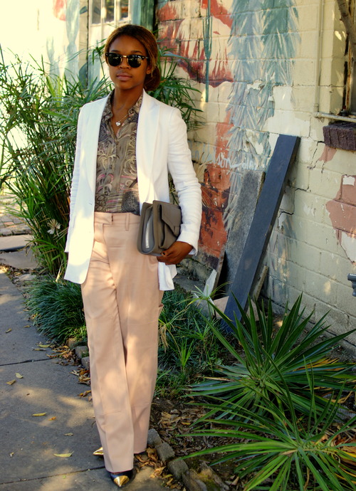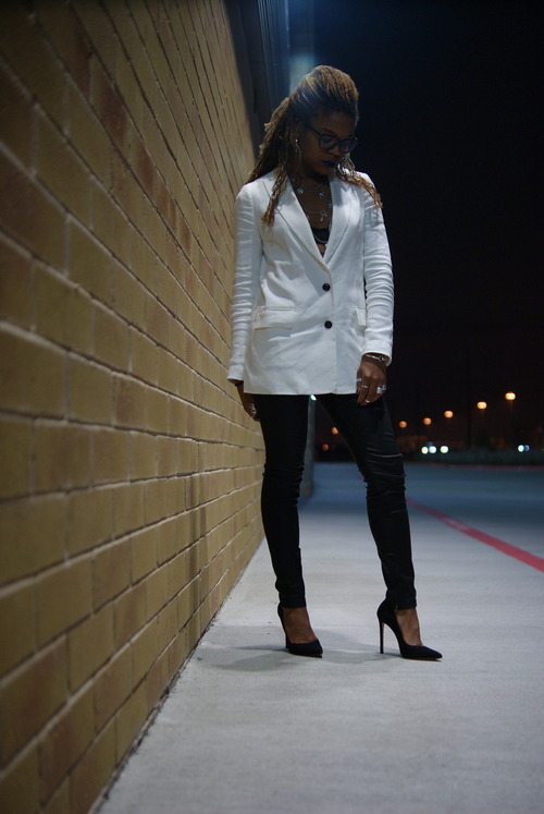 ” I also like edgy looks with a touch of something feminine like a single sole pump, a bejeweled necklace, or a pop of color on the fingernails.”