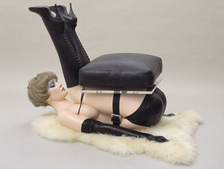 *I did a bit of research, and found that the chair seems to be an iteration of this bondage chair, created by Allen Jones ca. 1969. Apparently white strippers were put in compromising positions as well.