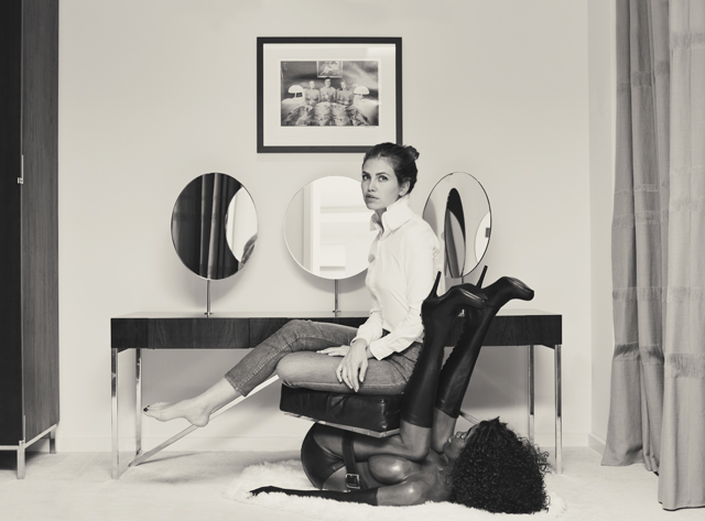 The Editor-in-Chief of Garage magazine perches on a black ‘dummy,’ (not a real human) who is nude save panties, a garter belt, elbow length gloves, and knee high boots, her folded knees suggestively pushing her naked breasts against her body. As Dasha stares out at the camera in the light filled room, she appears the total opposite of the compromised black woman on the floor. The message: prevailing, enduring white dominance and superiority, articulated in a seemingly serene yet overtly degrading way.
