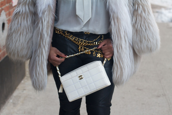 The coat made quite the statement, so I kept my look simple with a Zara pussy bow top and All Saints leather pants. I focused on accessories, namely Chanel chain belts and a Chanel bag from A Second Chance Resale.