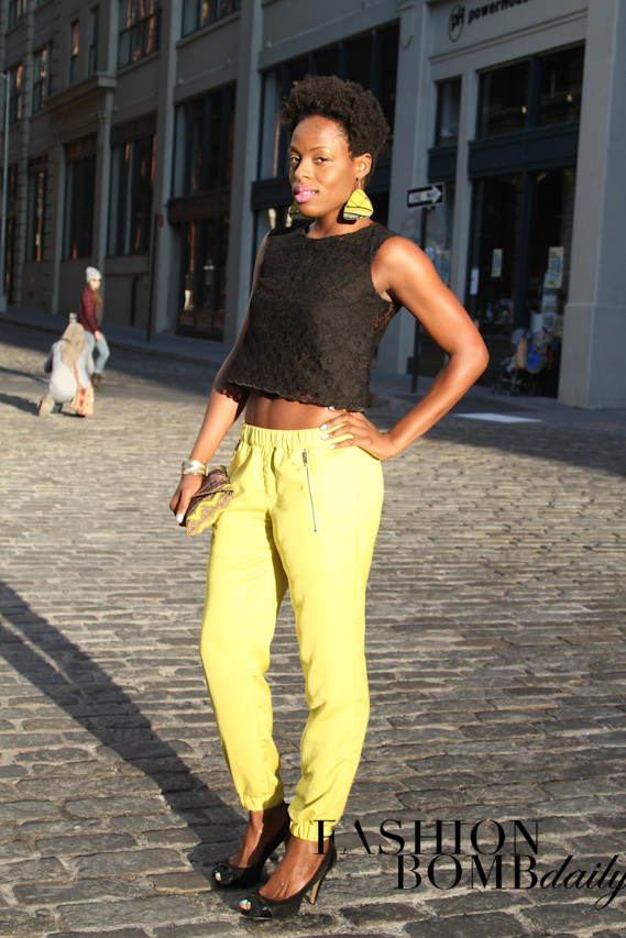This Fashion Bomb reader brought her black cropped top and yellow pants together with jazzy earrings.