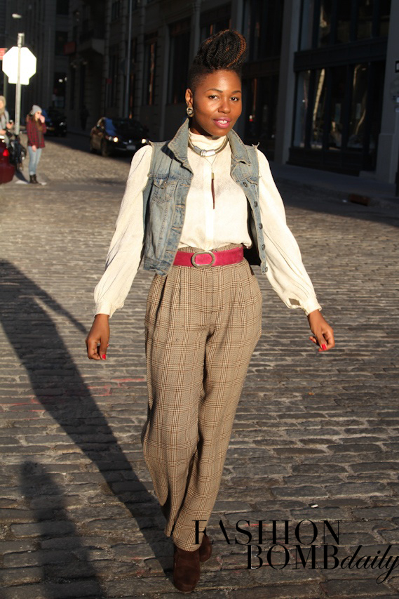 A white top and denim vest were enlivened by plaid pants and a braided updo.