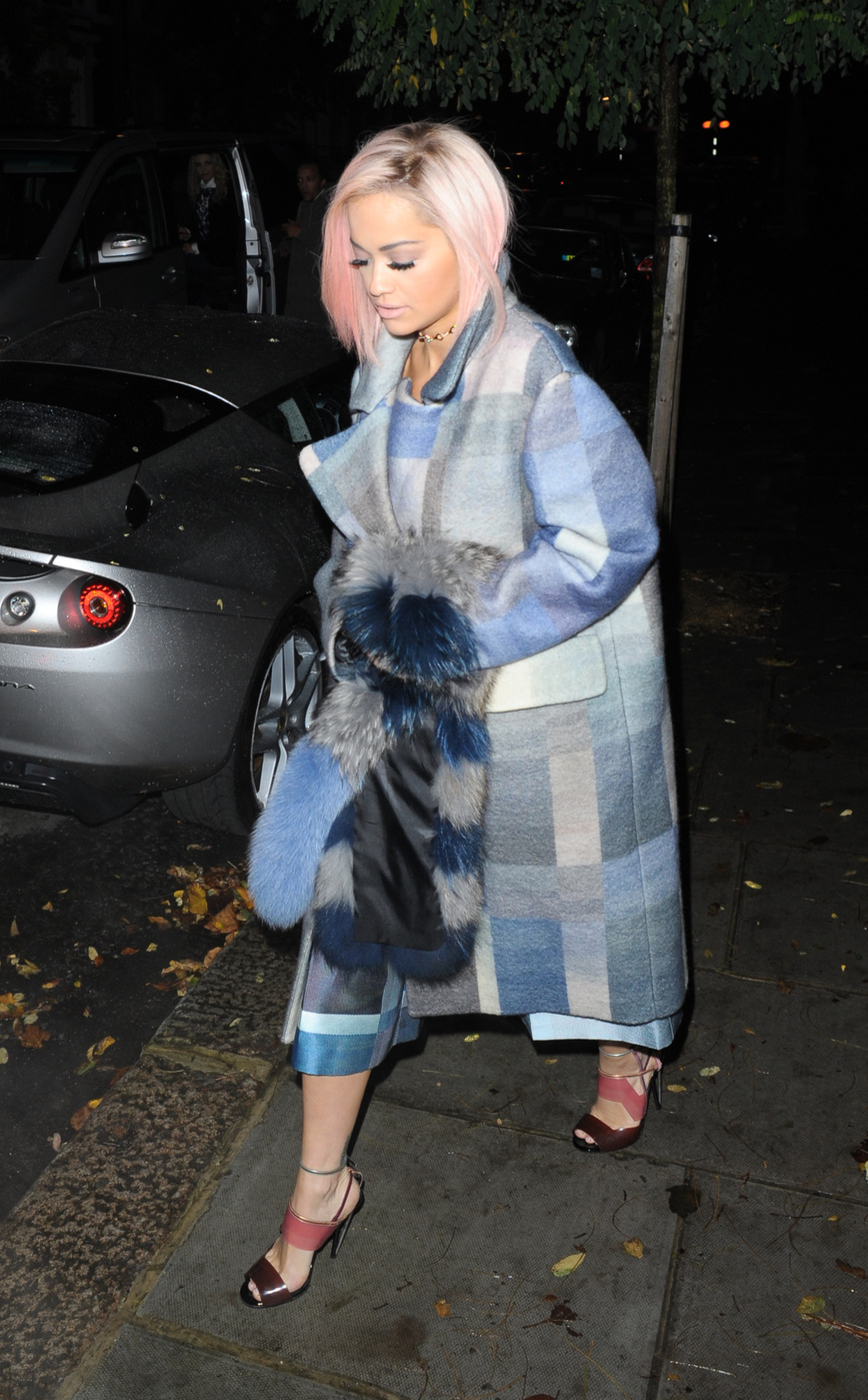 Rita Ora recovered from her weekend social media snafu* at Westfield Shepherds Bush for a Christmas Lighting Ceremony. She slipped a $745 Hoshi check coat over a plaid ensemble, and finished her look with Fendi PVC sandals: