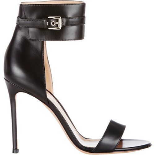 Her smooth open toe black calfskin stiletto 4″ heel sandals feature a thin buckle strap layered over wide ankle cuff.