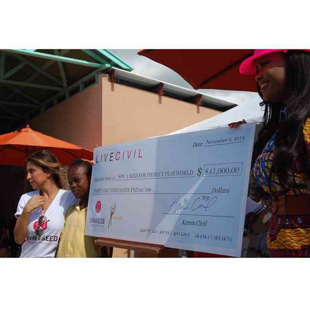 Blogger Karen Civil decided to give back on her 30th birthday, and build a playground in Haiti’s Nouvelle Zorange in Village de la Renaissance. For the groundbreaking, she slipped on an $877 Panelled dress by Haitian-Italian designer Stella Jean: