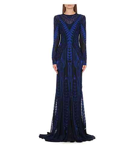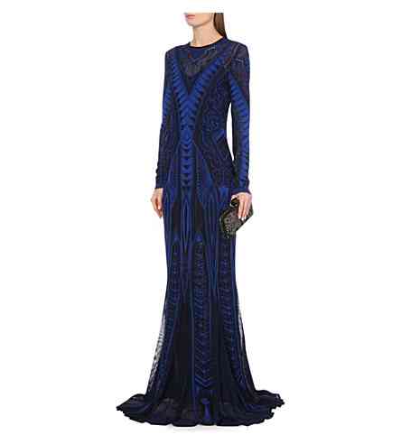 Her long-sleeved knitted gown is elaborately detailed with an intricate graphic motif and semi-sheer accents.