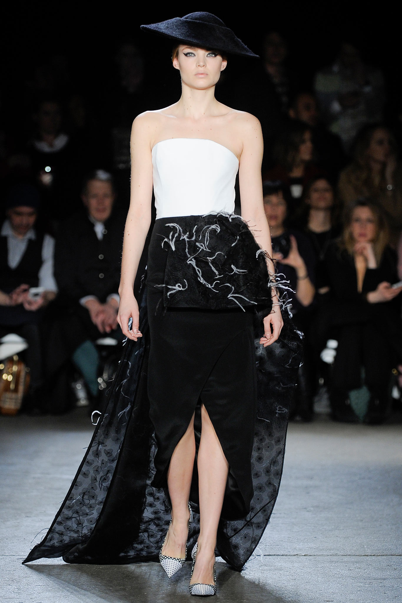 The eccentric black and white strapless gown from the young designer’s Fall 2014 collection features a long train embellished with feathery pieces.