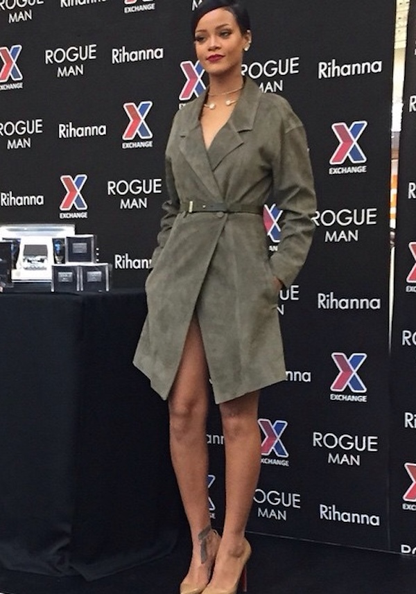 From performing in a sleek Tom Ford ensemble at the Concert For Valor in Washington D.C., pop sensation Rihanna appeared at Fort Belvoir Exchange to promote her latest Rogue Man fragrance while sporting a Spring 2015 Green Belted Trench and $675 Christian Louboutin So Kate pumps: