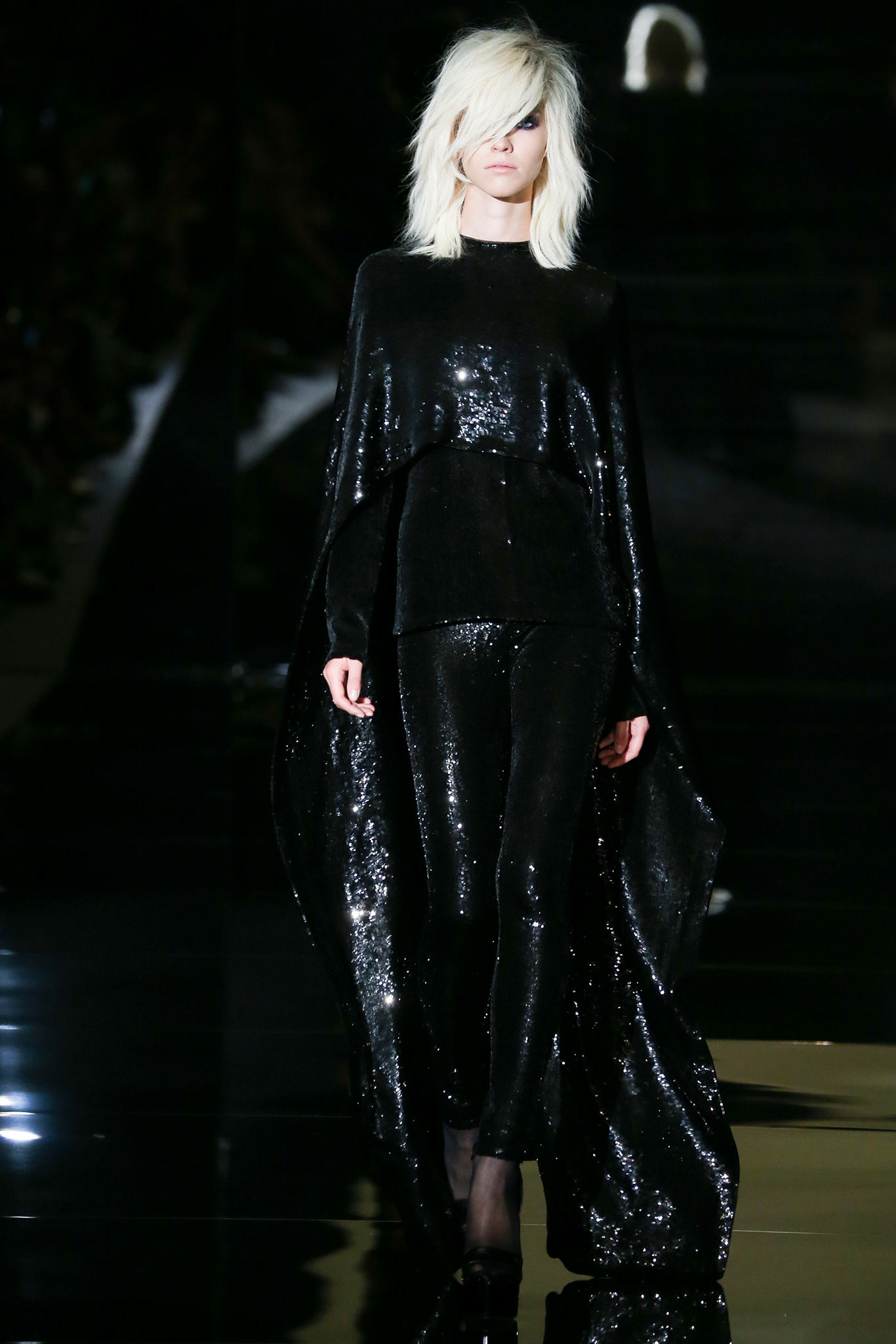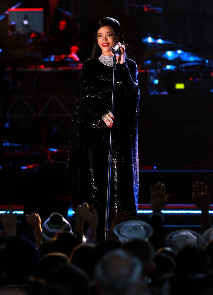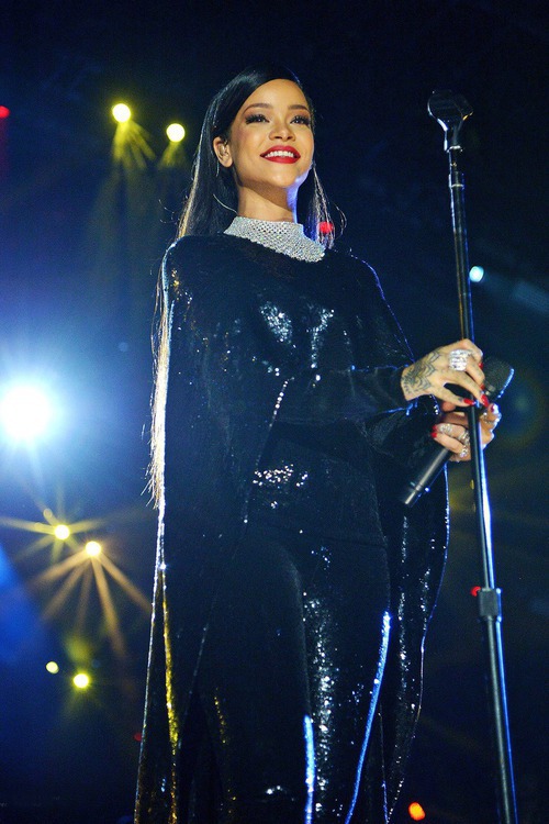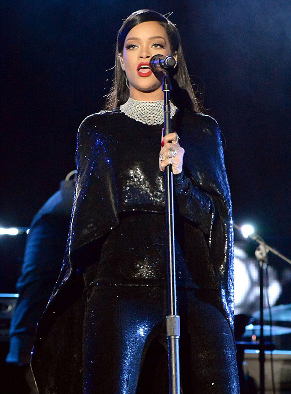 Rihanna performed hits like Diamond and Monster at last night’s Concert for Valor in D.C. in a black sequined cape and leggings from Tom Ford’s Spring 2015 collection: