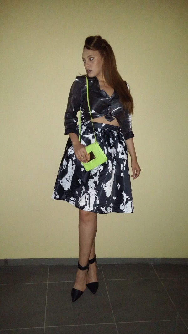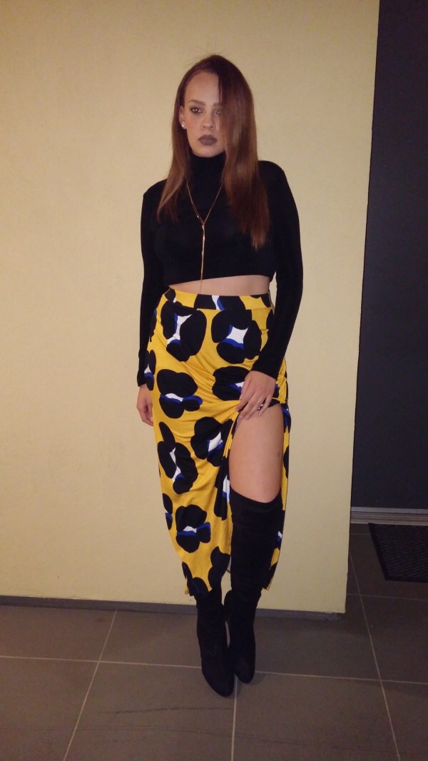 I love your turtle neck crop top with that saucy leg baring printed skirt. Cute! Be sure to write in with your Instagram info.