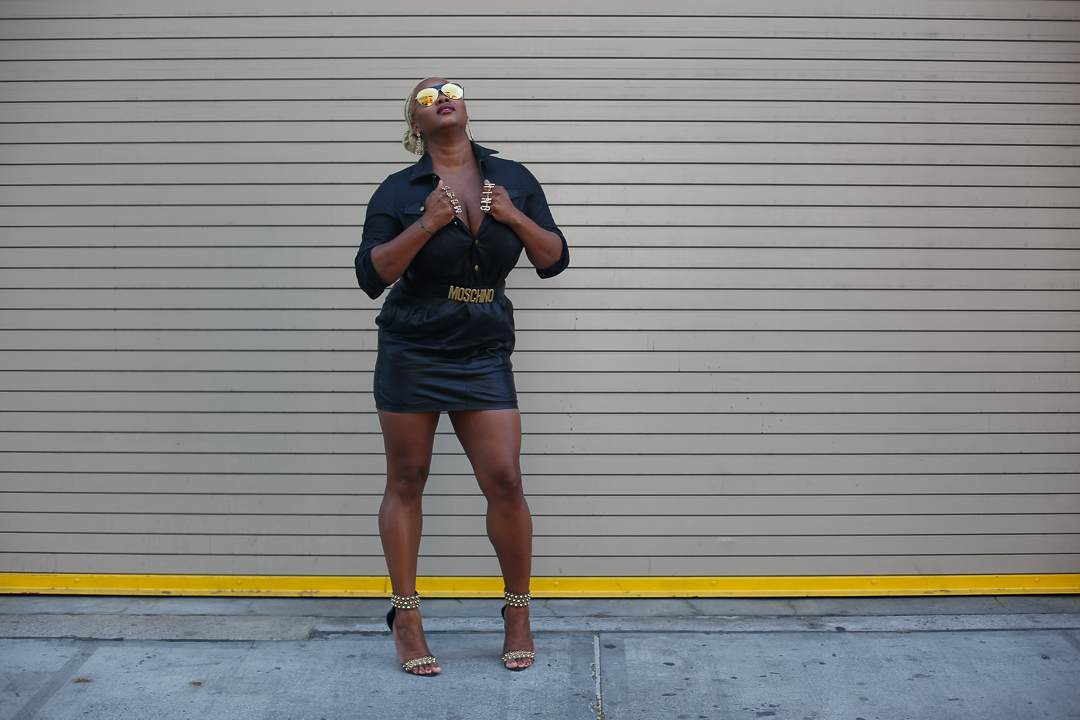 While we sidled up to Versace for the first one, this time, we went for Moschino (Damon’s choice!). I don’t have a ton of Moschino in my closet, so focused on accessories, uplifting a Current Elliott Mechanic Jacket worn as a shirt and a Blk Denim leather mini with a Moschino logo belt and Moschino knuckle rings.