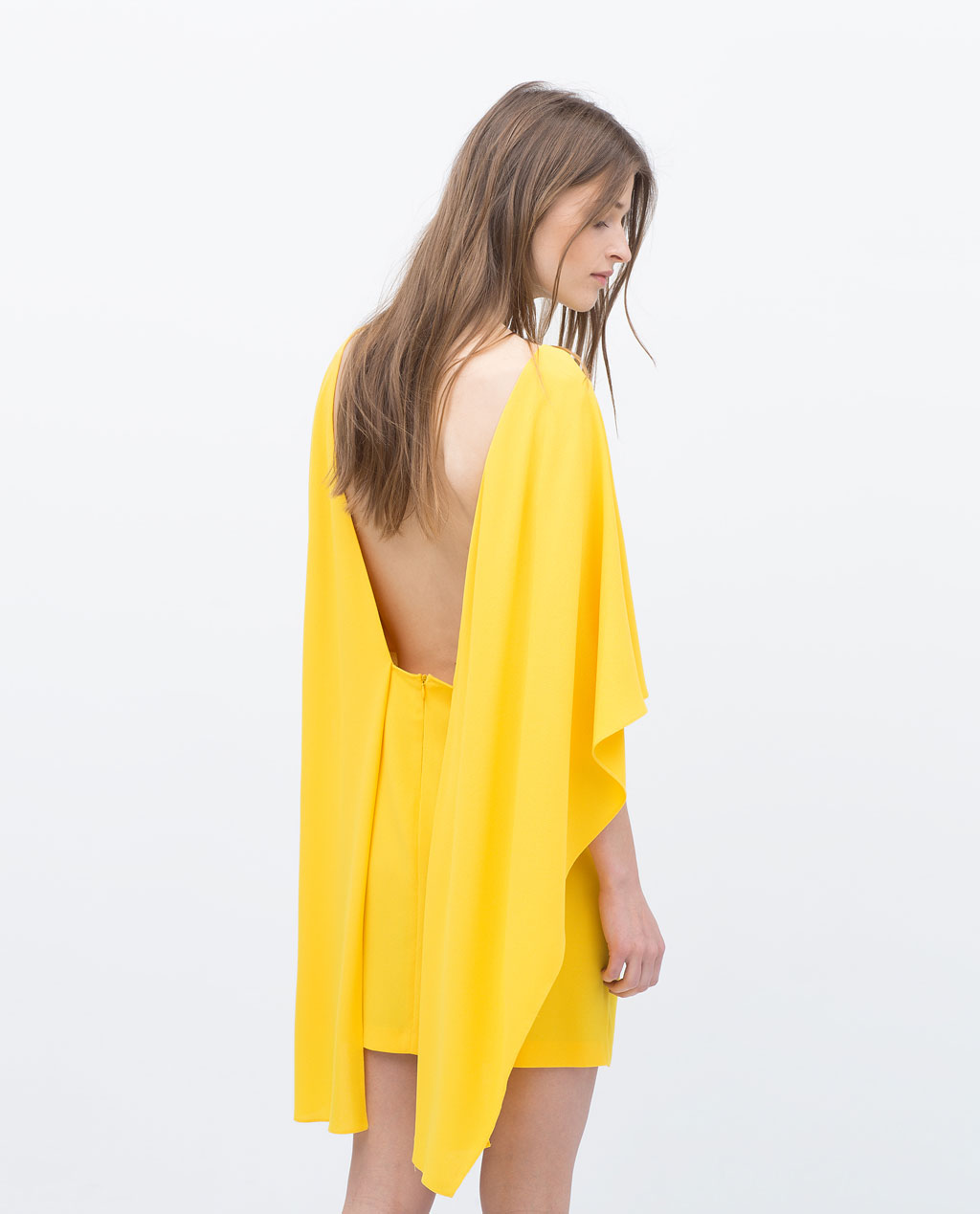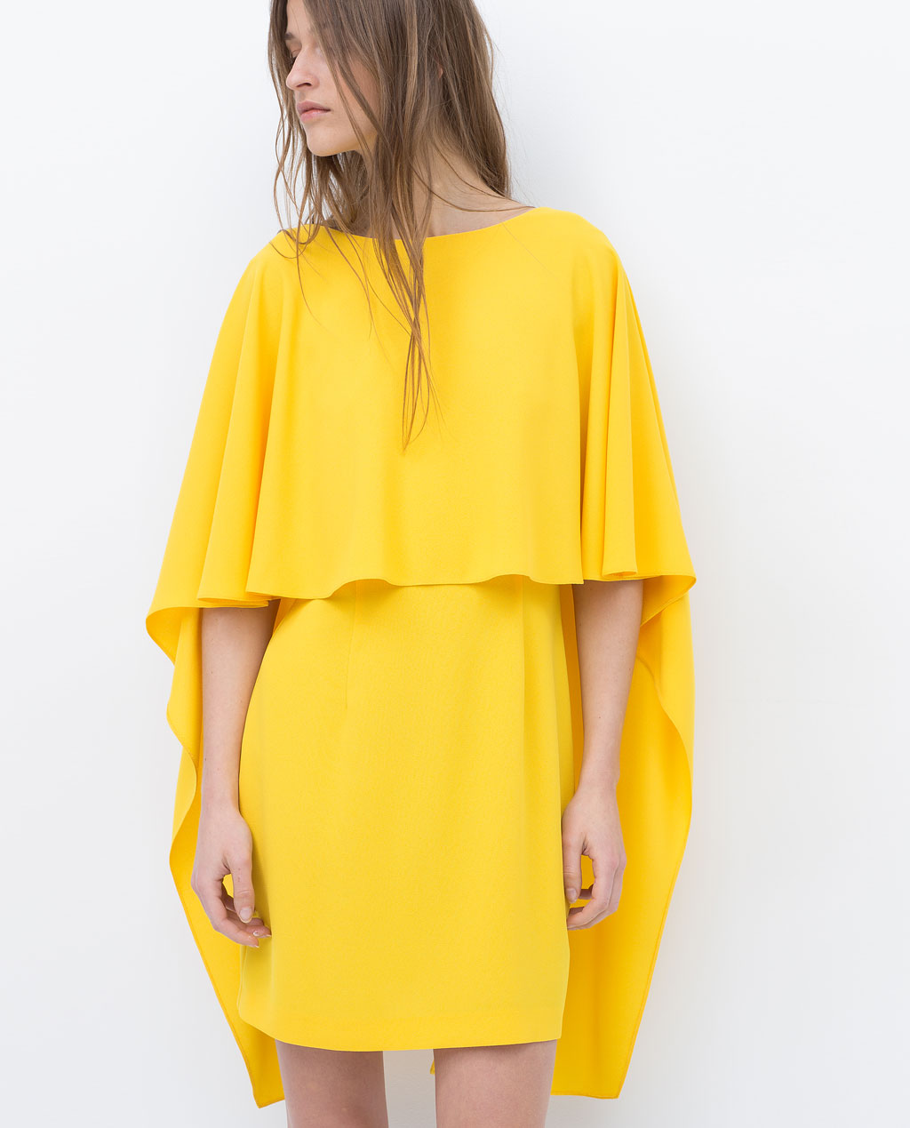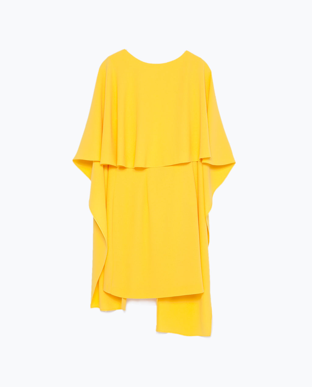 The Layered dress has a boat neck, a flowing cut, wide sleeves, and a low cut back.