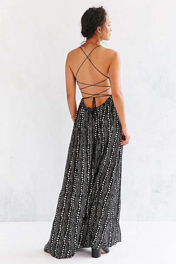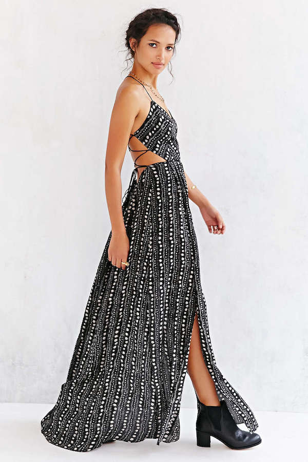 Broadway star Vanessa Hudgens was spotted in New York City sporting a summer perfect $98 Urban Outfitters Ecote Black and White Strappy Back Double Slit Safari Maxi Dress: