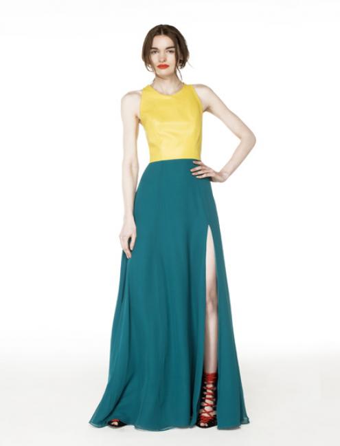 Her sleeveless dress features a yellow leather fitted bodice and a full flowy peacock-hued chiffon skirt with a thigh-high slit.