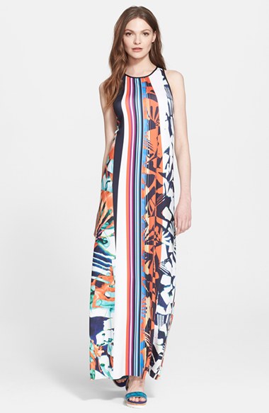 Her matte jersey maxi dress offers a vibrant mixture of bold stripes and lush digital prints, and boasts a sleek racerback.