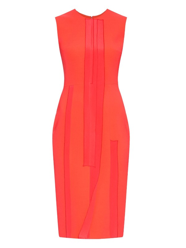 Her coral and orange cady dress features a round neckline, sleeveless silhouette, and matching layered silk-marocain front panels.