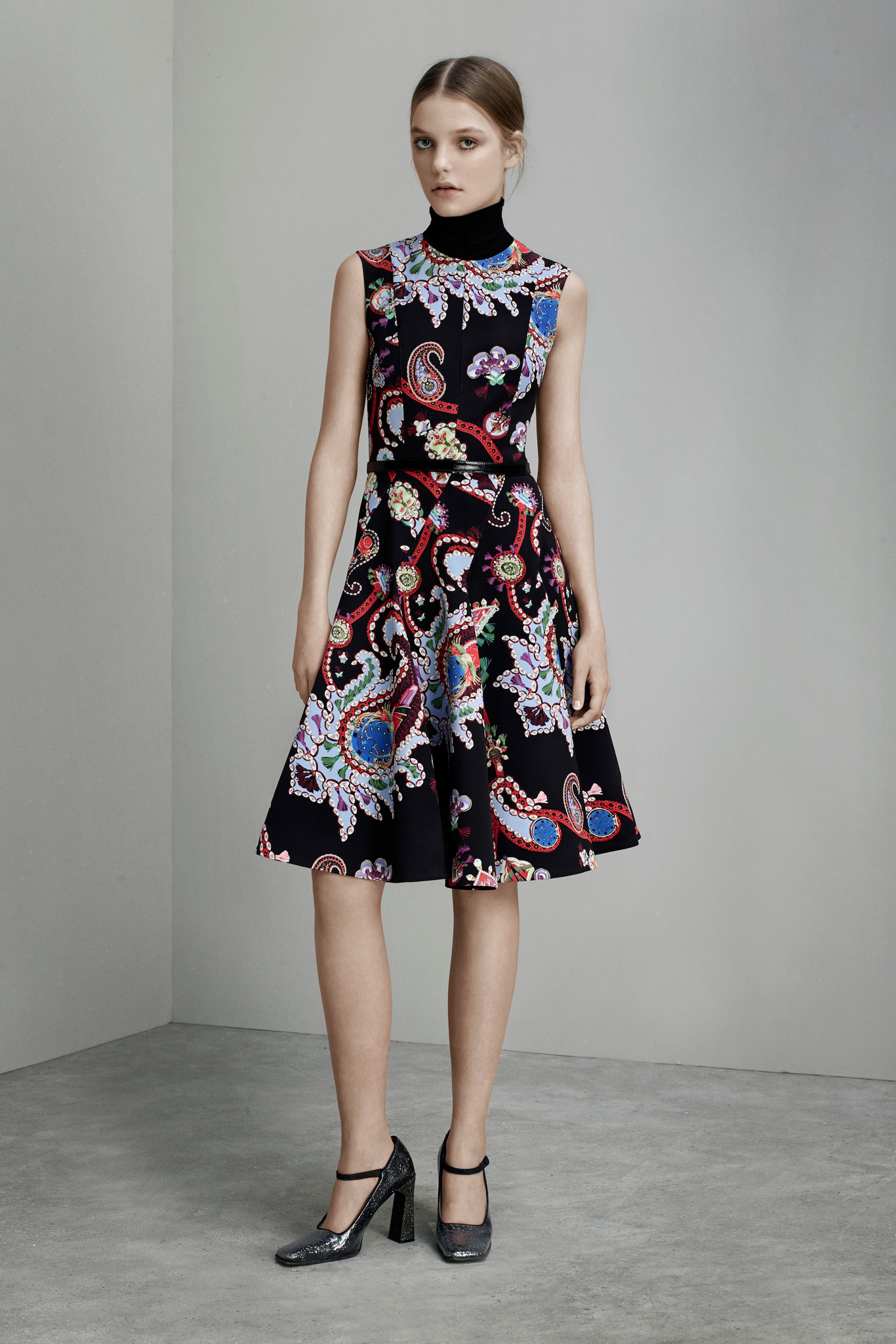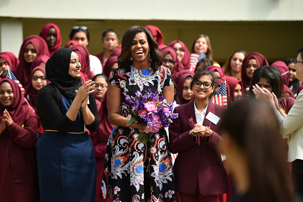 After deplaning in a Preen by Thorton Bregazzi number, First Lady Michelle Obama took in her second day in the UK wearing a paisley printed Pre-Fall 2015 Mary Katrantzou dress. For the day’s line-up of events she had a visit to the Mulberry School for Girls and had tea with Prime Minister David Cameron and his wife.
