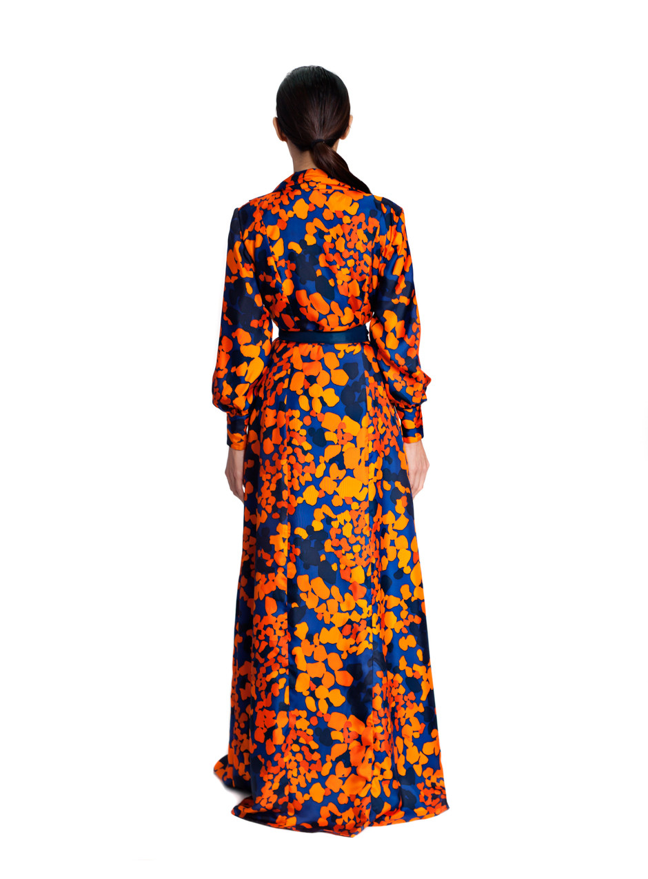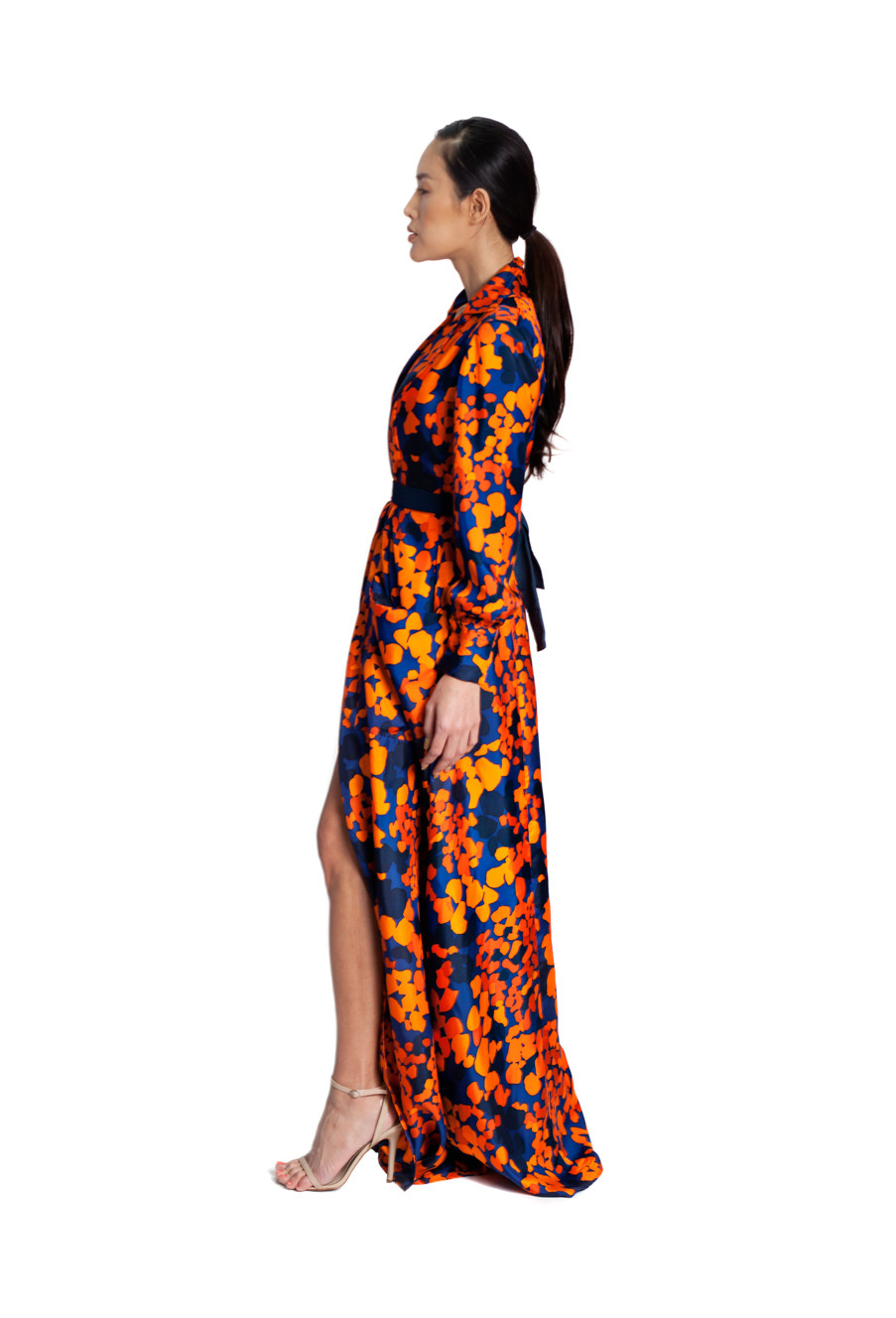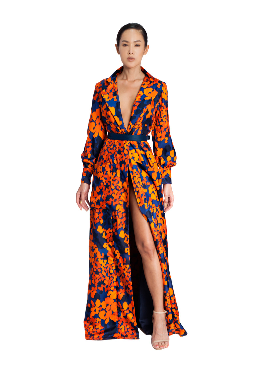 The silk charmeuse dress has a high slit and a detachable belt.