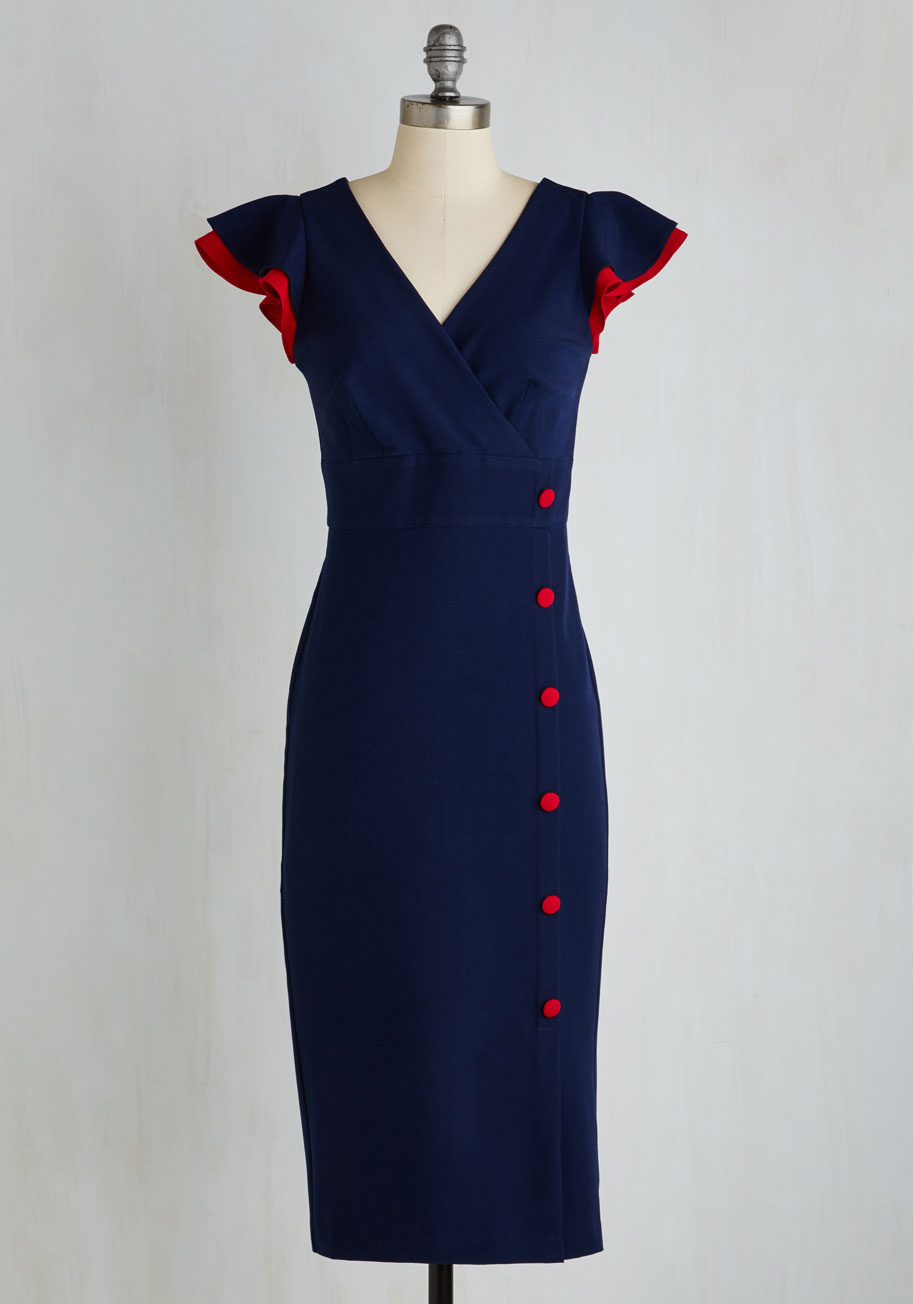 She’s wearing a $175 blue and red pinup style frock from Modcloth.com.