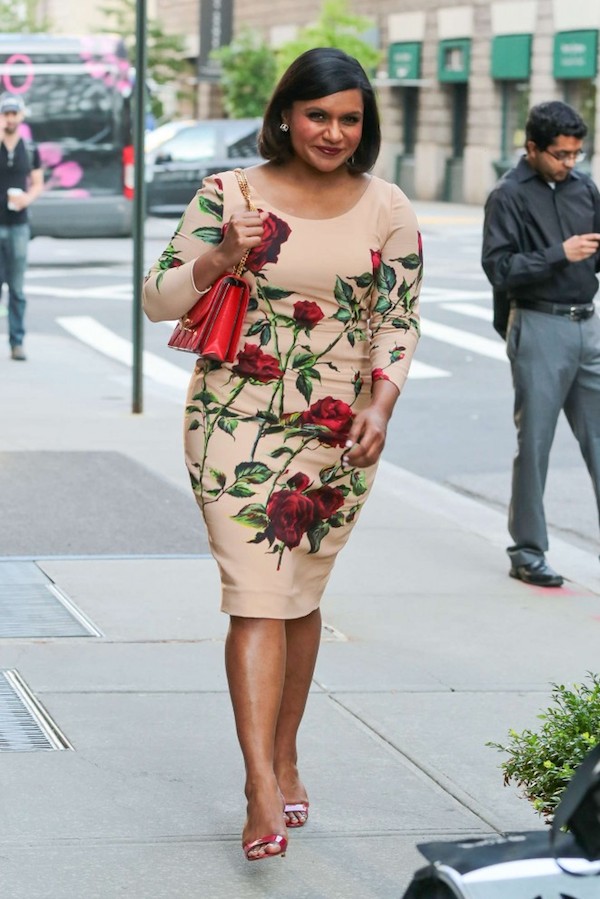 Mindy Kaling was fabulously spotted on the streets of New York City while sporting a sleek $2,495 Dolce & Gabbana Rose Print Long Sleeve Cady Shift Dress: