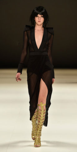The 17-year-old hosted the Miami Opening of the Sugar Factory in a Fall 2015 deep plunge black gown by House of Zhivago: