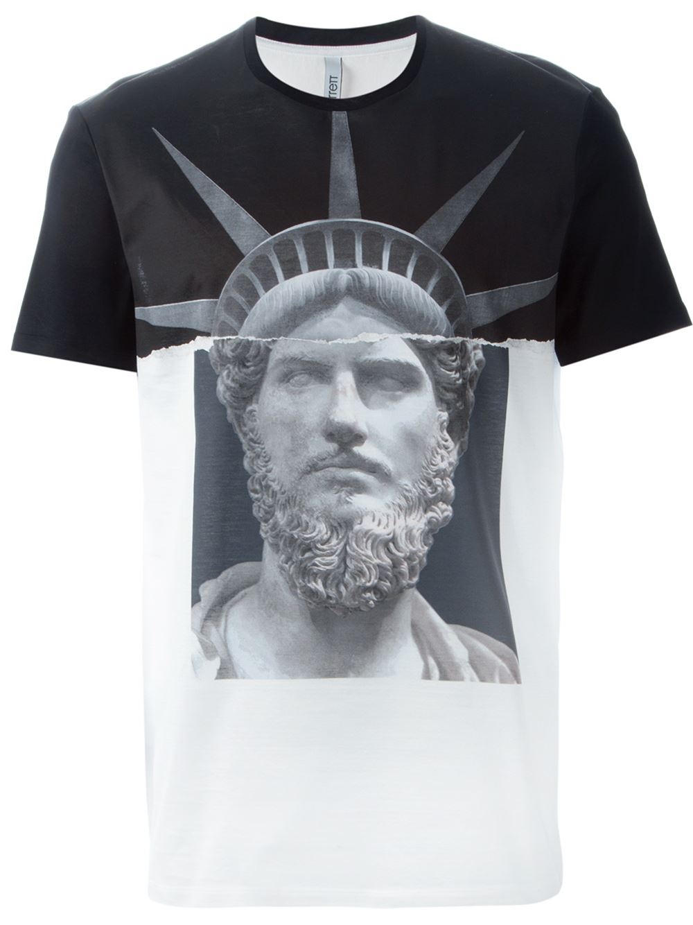 His black and white cotton T-shirt from boasts a round neck, short sleeves, a color blocked design, a straight hem, and a grey statue of liberty and Samson print on the front.