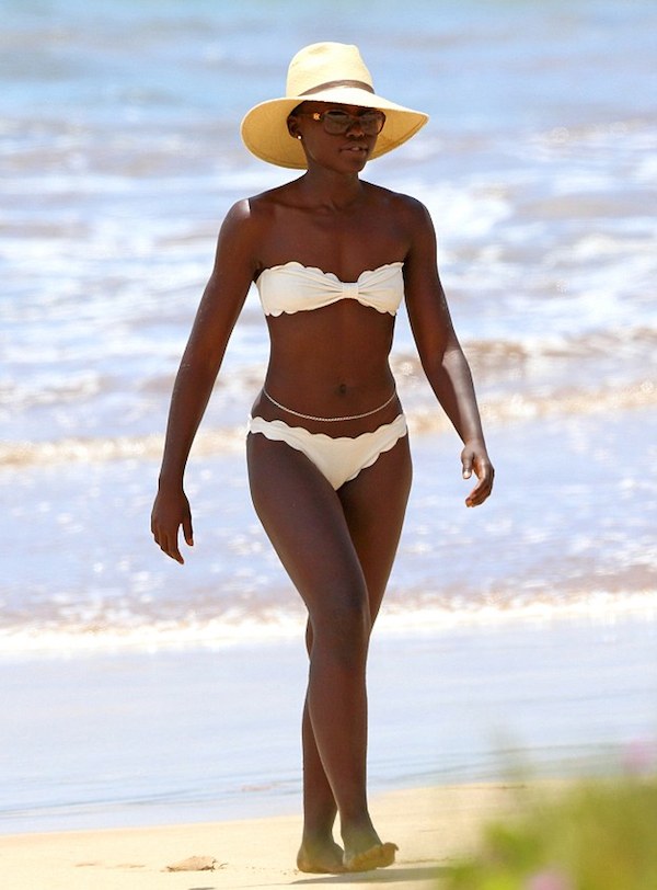 Take inspiration from Lupita Nyong’o, who wore a similar hat with a white bikini for a day in the sun and sand.