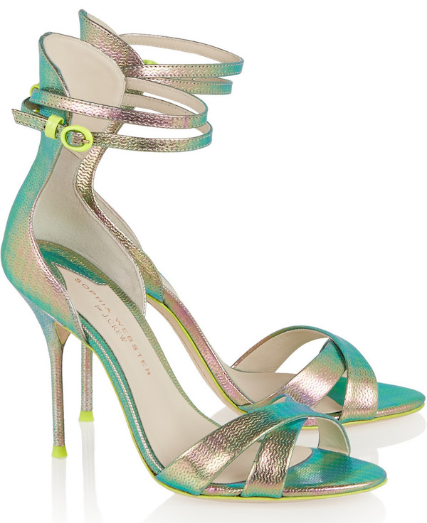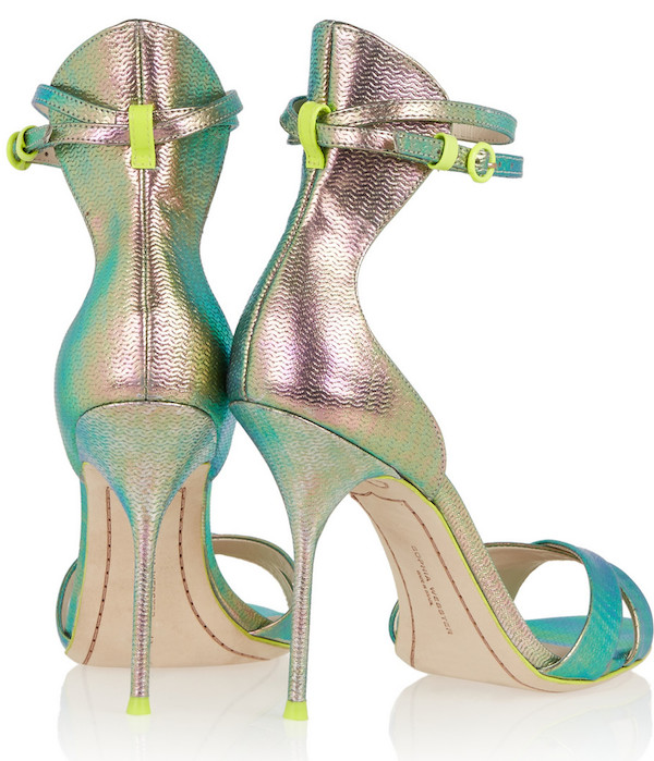 Her striking 5″ heel sandals are crafted from shimmering iridescent textured leather.