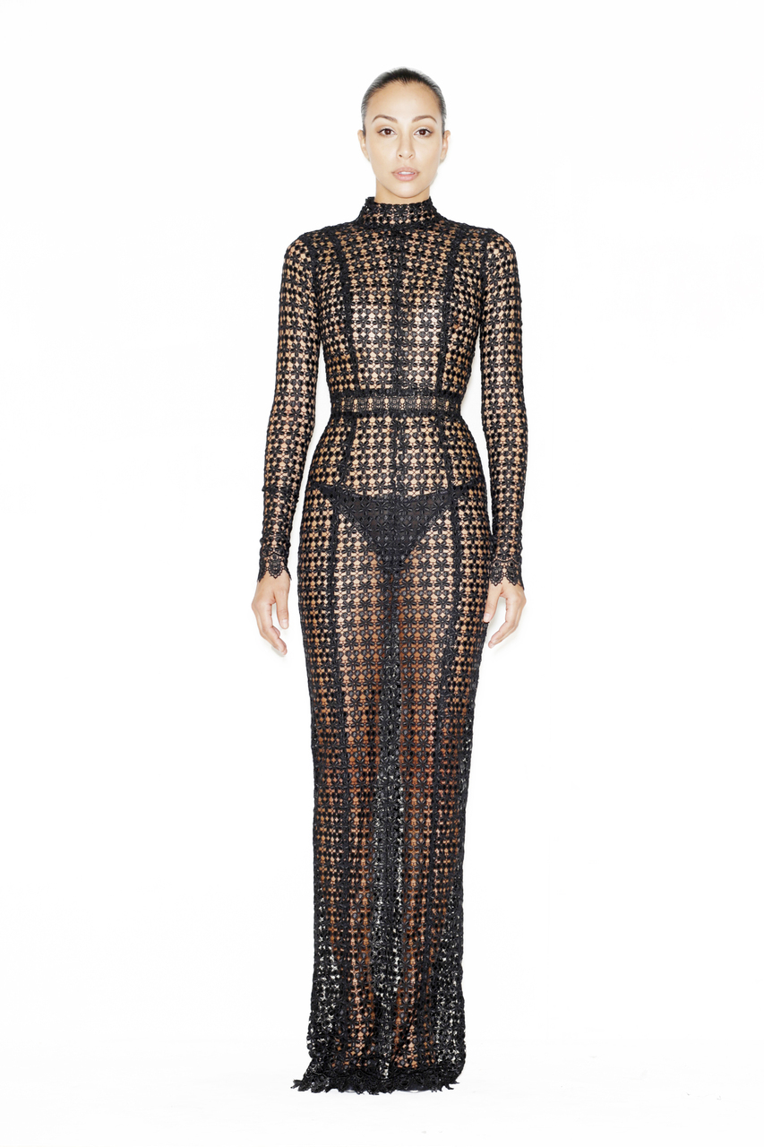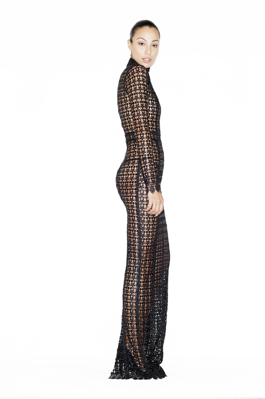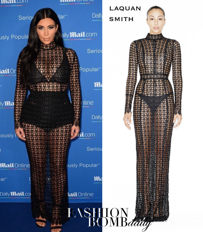 She boarded a yacht for a Daily Mail event in an $895 Patricia Lace Maxi by Laquan Smith: