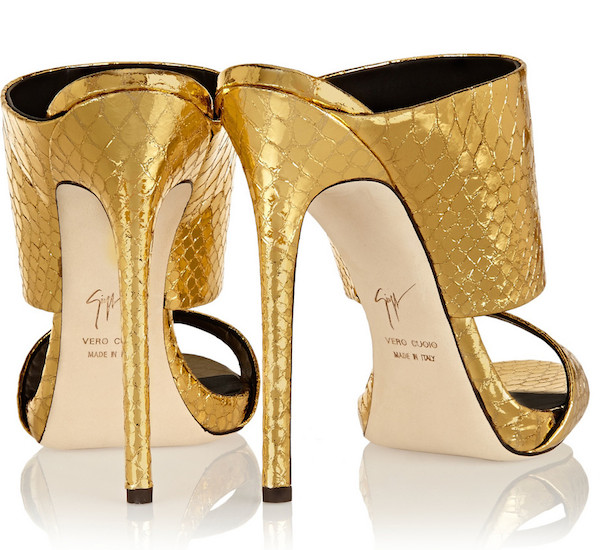 Her sold out gold stunners feature an open toe snakeskin effect with a brand embossed insole, metallic sheen and a high stiletto heel.