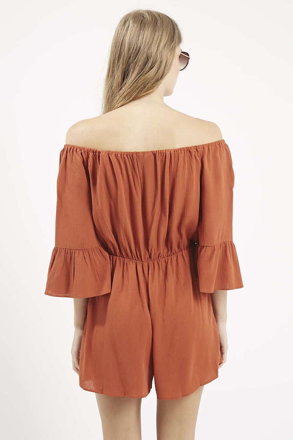 Her bohemian feel bardot playsuit places shoulders and legs on display.