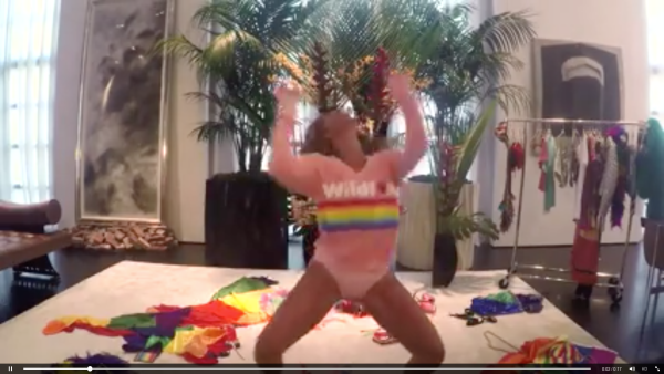 In the clip, amongst other things, she wore a Wild Fox Couture Ombre Malibu One Piece bathing suit and a VFILES Sport Plus Green and Black Girl Power Jersey.