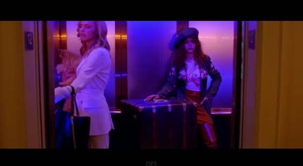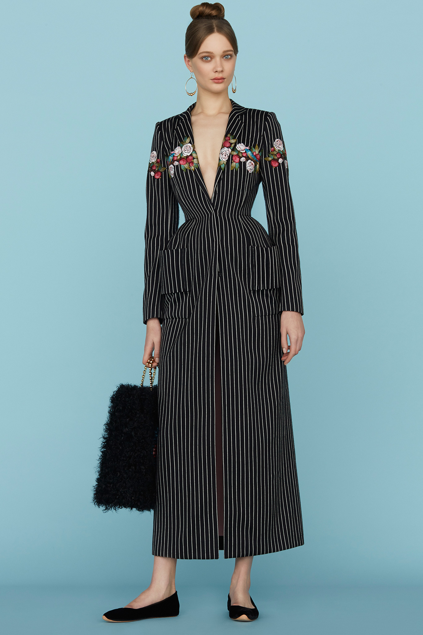 In the opening scene, she wears an Ulyana Sergeenko Spring 2015 Couture wool pinstripe coat with hand embroidered floral detailing: