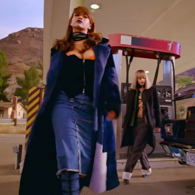 In a later scene she fills up her get away vehicle in a Tom Ford Fall 2015 blue patchwork coat and thigh high boots, ripped straight from the runway:
