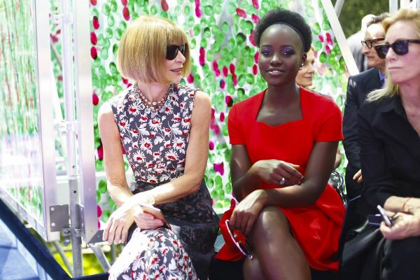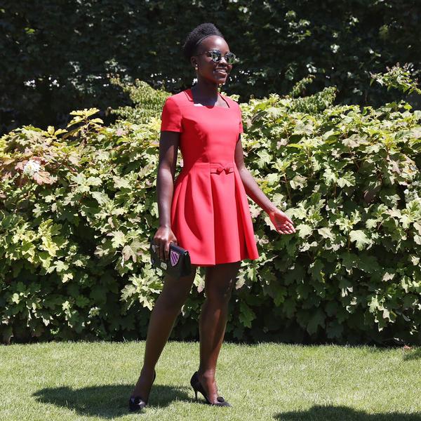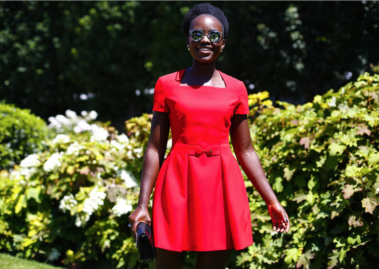 As the Essence Music Festival wound down, things in Paris geared up for couture week. Today, Raf Simons offered his latest collection at Dior with billowing shapes and cape-like overcoats. Though only two models of color were a part of the casting, Lupita Nyong’o was front and center for the event, wearing a custom red pleated Dior Couture frock, Dior ‘So Real’ sunglasses, a Dior badge embellished clutch, and sensible heels.