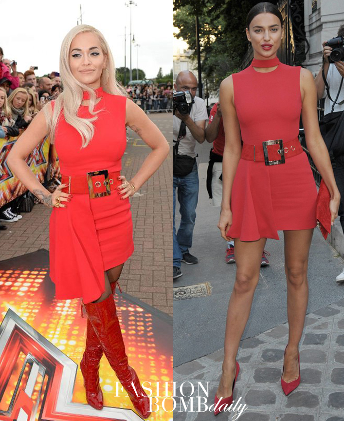 Rita Ora appeared at the X Factor UK Manchester Auditions in the same $1,875 Versace Red Cutout Viscose Blend Crepe Dress Irina Shayk wore to the Vogue Paris Foundation Gala: