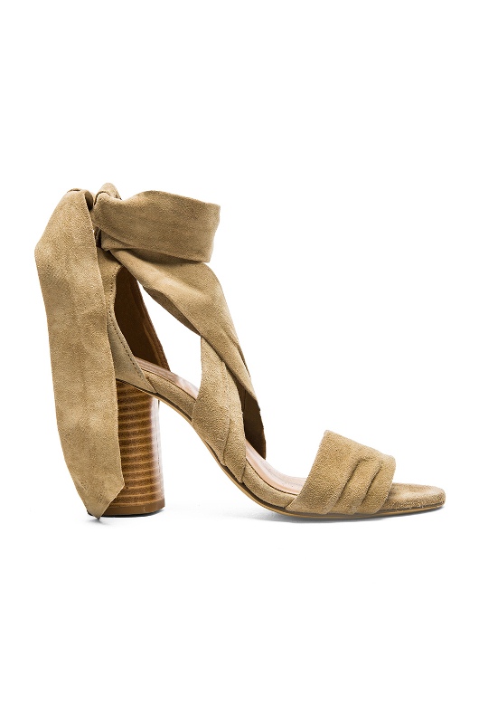 Her suede sandals showcase wrap-around straps and functional 3.5″ heels.