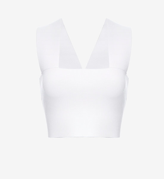 Her crop top has a square cut neckline.