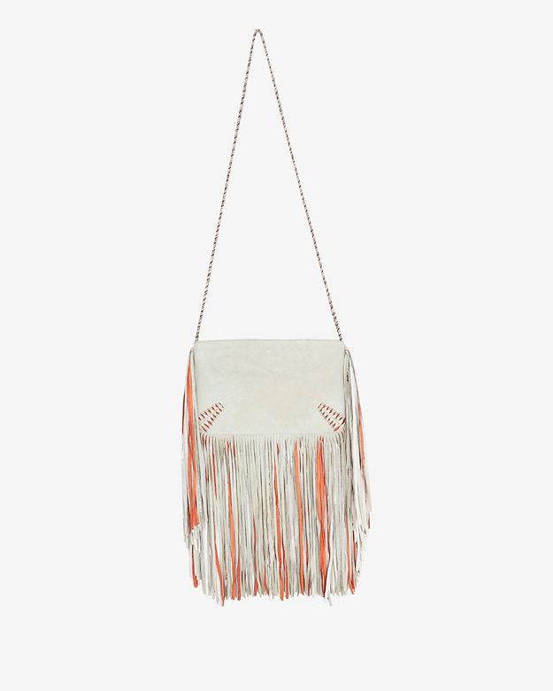 Her bag boasts copious fringe and a braided strap.