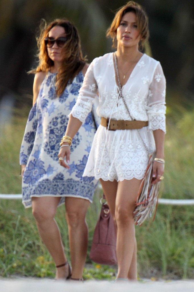 J. Lo looked stunning in Miami, and shopped it up with friends in a $185 ALC White Crop Top and a $275 Twelfth Street by Cynthia Vincent Ruffled Mini Skirt: