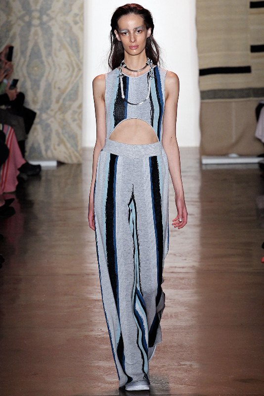Gabrielle Union and husband Dwyane Wade partied at the New York Fashion Week Men’s S/S 2016 Opening Event, with Gabrielle in a Baja East Fall 2015 Cap Sleeve Long Trench and Stripe Cutout Jumpsuit: